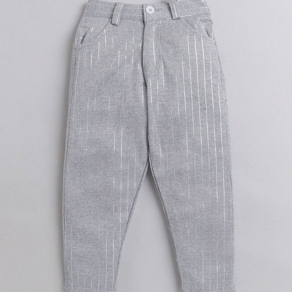 Grey striped mid-rise trousers has a zip fly with a button and a hook-and-bar closure, four pockets, a waistband with belt loops